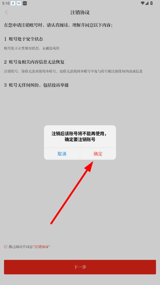 4、在注銷協(xié)議頁(yè)面,仔細(xì)閱讀相關(guān)內(nèi)容后,點(diǎn)擊彈出窗口中的確定按鈕,完成賬號(hào)注銷操作。