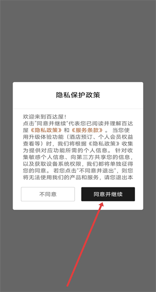 1、點(diǎn)擊同意并繼續(xù)按鈕,同意百達(dá)屋隱私保護(hù)政策,進(jìn)入APP主界面。