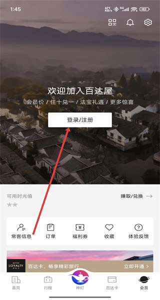 3、在會員界面,點(diǎn)擊登錄/注冊按鈕,進(jìn)入登錄注冊界面。