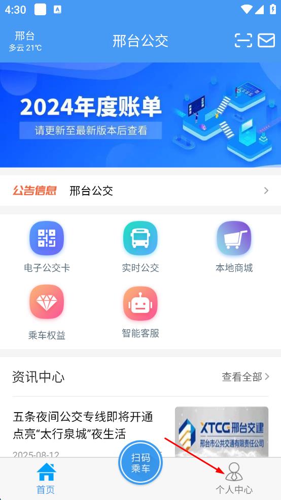 1、打開邢臺(tái)公交APP,在首頁(yè)點(diǎn)擊右下角“個(gè)人中心”選項(xiàng),進(jìn)入個(gè)人中心頁(yè)面。