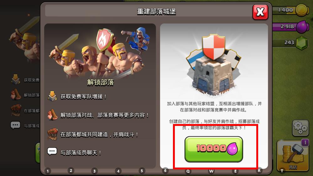 3、若需重建部落城堡,確認(rèn)花費(fèi)10000圣水瓶資源。