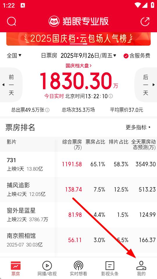 1、在貓眼app的首頁,需要點(diǎn)擊底部我的按鈕,進(jìn)入個(gè)人頁面。