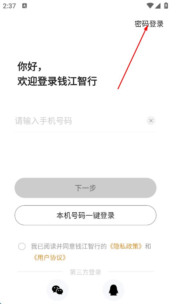 1、打開(kāi)錢江智行APP,進(jìn)入登錄頁(yè)面后,點(diǎn)擊頁(yè)面右上角“密碼登錄”選項(xiàng)。
