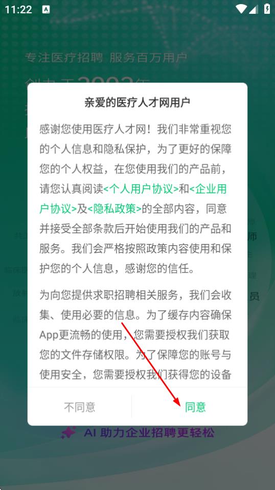 1、打開醫(yī)療人才網(wǎng)APP,在彈出的用戶協(xié)議及隱私政策提示頁面,點擊同意。