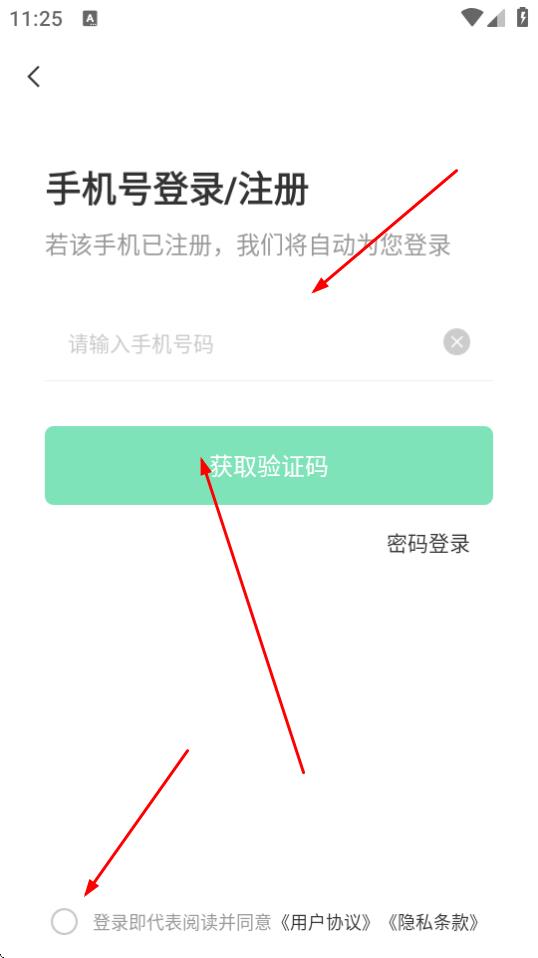 2、進入手機號登錄/注冊頁面,輸入手機號碼,勾選登錄即代表閱讀并同意用戶協(xié)議隱私條款,點擊獲取驗證碼。