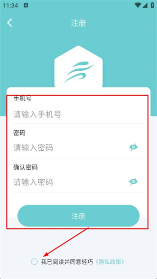 2、輸入手機(jī)號、密碼,確認(rèn)密碼,勾選同意隱私政策,點(diǎn)擊注冊。
