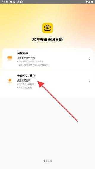 1、開美團(tuán)直播助手APP,首頁呈現(xiàn)我是商家與我是個(gè)人/其他兩個(gè)入口,按需點(diǎn)擊。