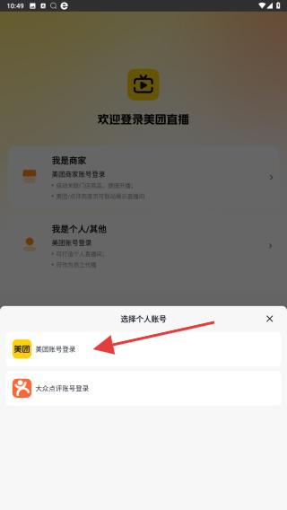 2、點(diǎn)擊我是個(gè)人/其他,底部彈出美團(tuán)賬號(hào)登錄、大眾點(diǎn)評(píng)賬號(hào)登錄,任選其一進(jìn)行登錄。