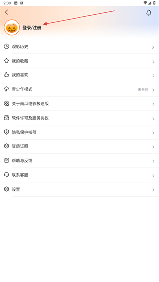 1、打開(kāi)南瓜電影APP,進(jìn)入首頁(yè)內(nèi)點(diǎn)擊左上角頭像的圖標(biāo)。