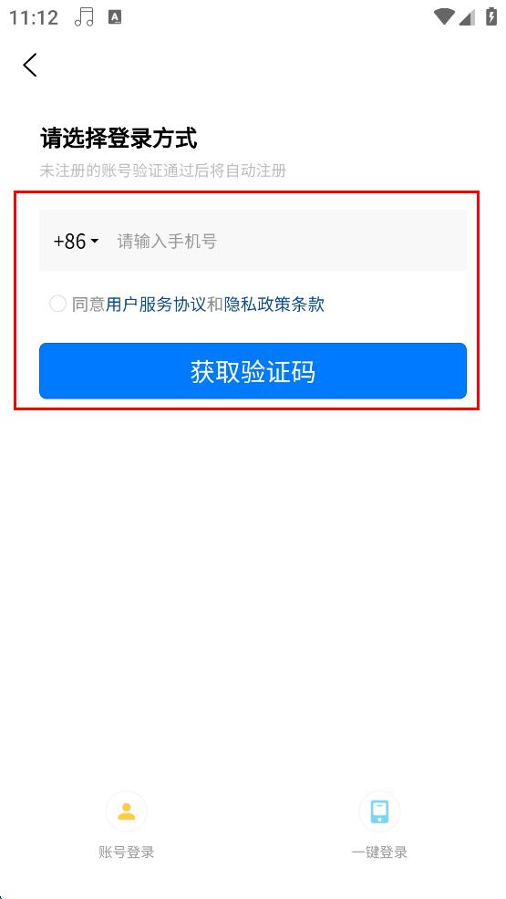 4、在請(qǐng)選擇登錄方式頁(yè)面輸入手機(jī)號(hào),勾選同意用戶服務(wù)協(xié)議和隱私政策條款,點(diǎn)擊獲取驗(yàn)證碼,收到后輸入驗(yàn)證碼完成登錄。