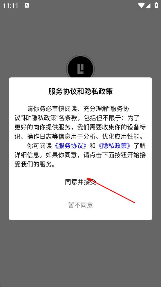 1、打開(kāi)該音樂(lè)App,出現(xiàn)服務(wù)協(xié)議和隱私政策彈窗,閱讀后點(diǎn)擊同意并接受按鈕。