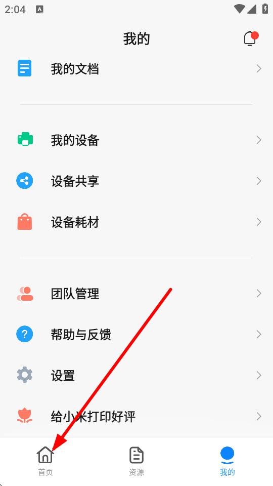 1、打開小米打印app,點(diǎn)擊底部導(dǎo)航欄中的首頁圖標(biāo)進(jìn)入首頁界面。