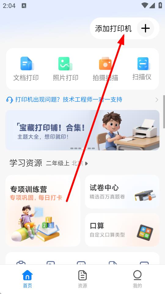2、在首頁界面中,點(diǎn)擊右上角的添加打印機(jī)按鈕。