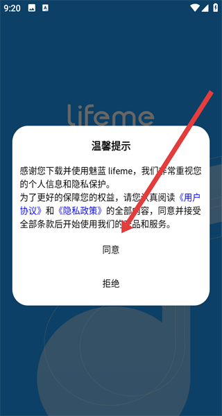 1、打開魅藍(lán)lifeme,點擊同意按鈕,確認(rèn)用戶協(xié)議和隱私政策,進(jìn)入主界面。