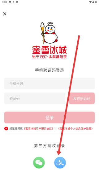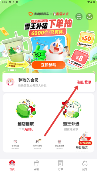 1、在蜜雪冰城應(yīng)用首頁中,可以點(diǎn)擊注冊(cè)/登錄按鈕,開始登錄操作。