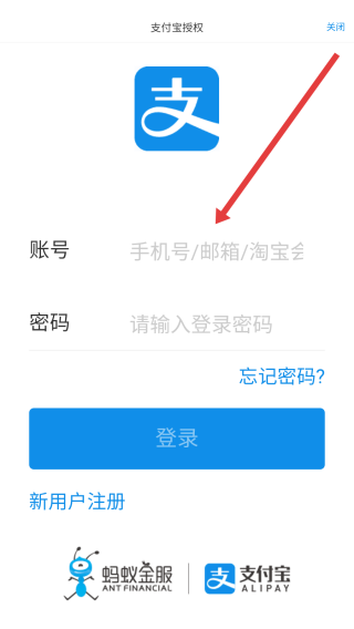 3、在跳轉(zhuǎn)到支付寶登錄頁面后,點(diǎn)擊輸入框依次輸入賬號(hào)和密碼完成登錄操作。