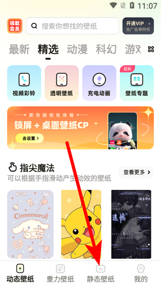 1、在皮皮動態(tài)壁紙首頁,點擊靜態(tài)壁紙選項,進入壁紙分類頁面。