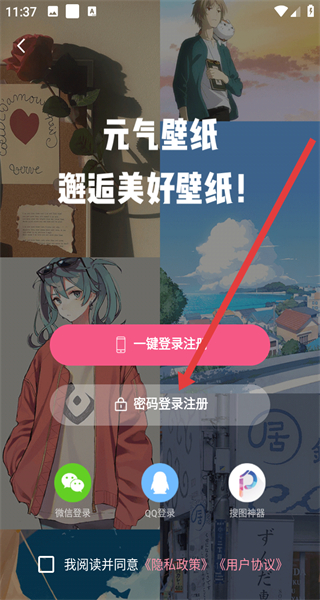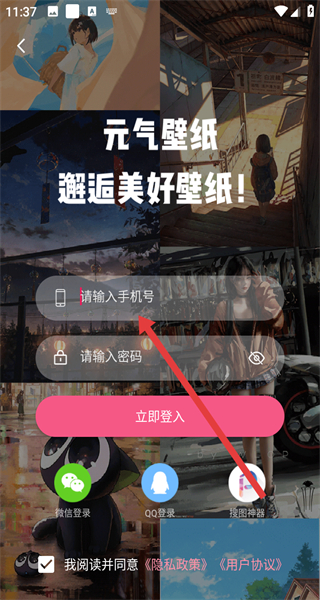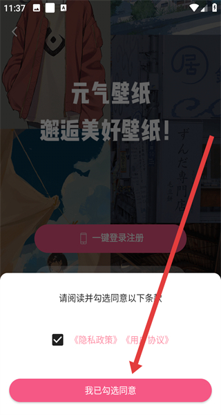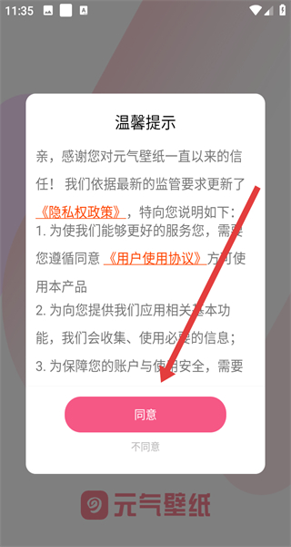 1、打開元氣壁紙APP,點擊同意按鈕,確認隱私權(quán)政策和用戶使用協(xié)議,進入登錄界面。