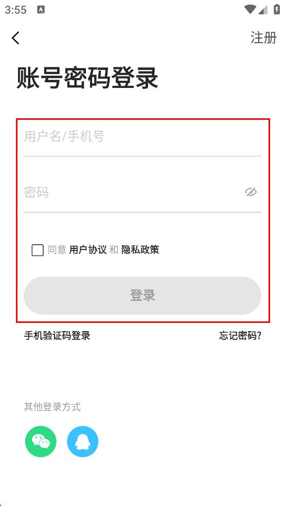 4、在賬號密碼登錄界面輸入用戶名或手機號、密碼,勾選同意用戶協(xié)議和隱私政策后點擊登錄,完成登錄操作。