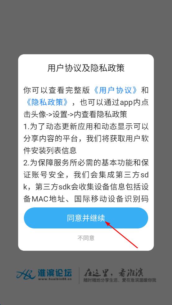 1、打開淮濱論壇,彈出用戶協(xié)議及隱私政策提示,點擊同意并繼續(xù),進(jìn)入軟件首頁。