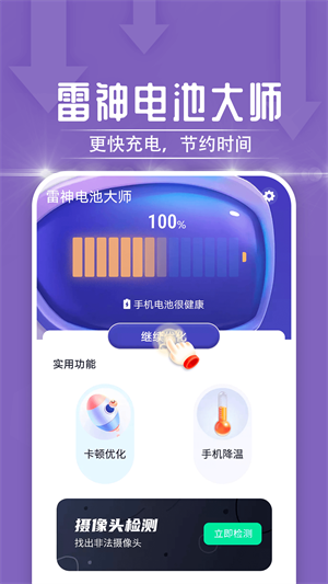 一鳴雷神電池大師是手機(jī)上的電池助手,擁有多樣的優(yōu)質(zhì)服務(wù)讓大家使用,簡(jiǎn)單操作輕松進(jìn)行電池優(yōu)化,聲波除塵、攝像頭檢測(cè)、紀(jì)念日記錄等服務(wù)均可在線使用,為大家?guī)?lái)優(yōu)質(zhì)的服務(wù),隨時(shí)隨地在線輕松記錄,體驗(yàn)到優(yōu)質(zhì)的服務(wù)。
