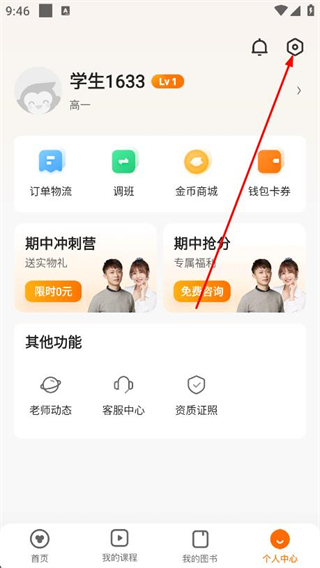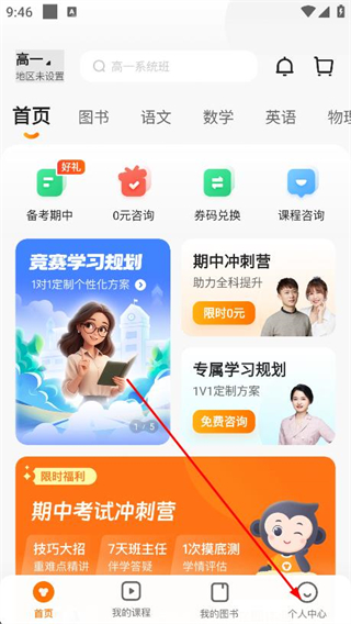 1、進(jìn)入后首頁(yè)面含暑期沖刺、選課咨詢(xún)、課程咨詢(xún)、券碼兌換等快捷功能,點(diǎn)底部個(gè)人中心。