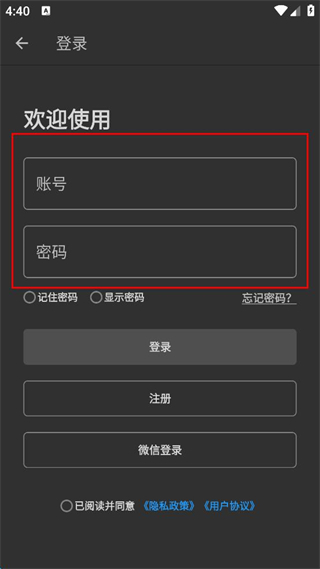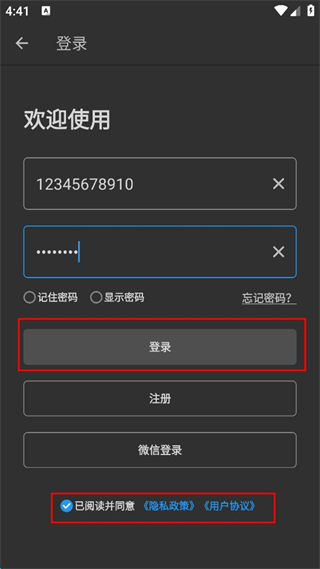 3、在登錄頁(yè)面輸入賬號(hào)和密碼,勾選已閱讀并同意隱私政策,用戶協(xié)議。