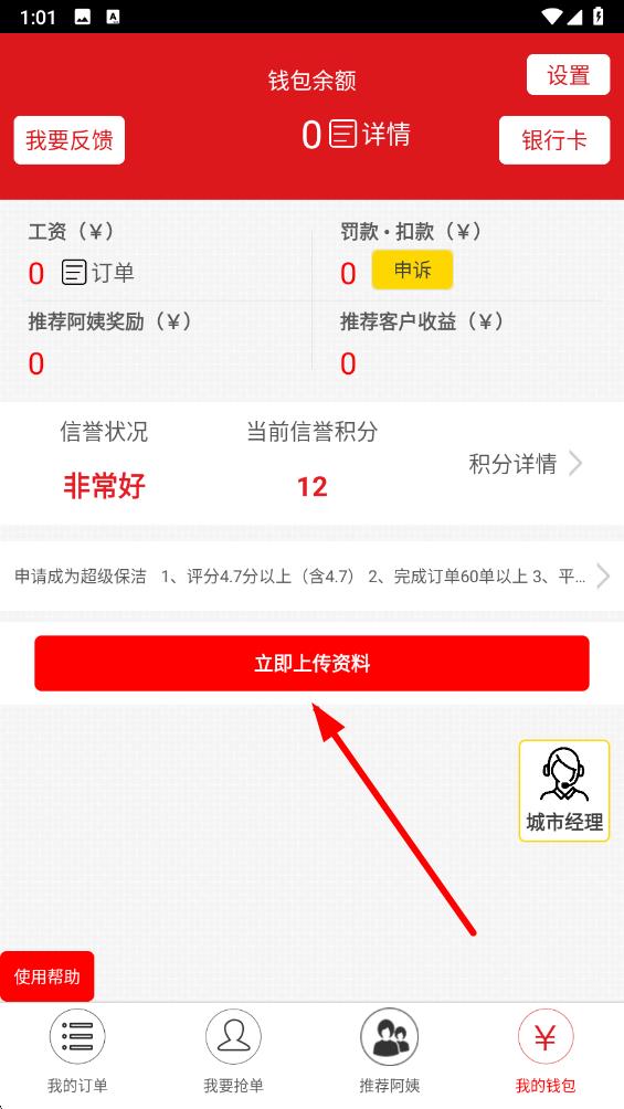 2、在我的錢包頁面,點擊立即上傳資料按鈕,進入上傳個人資料界面。