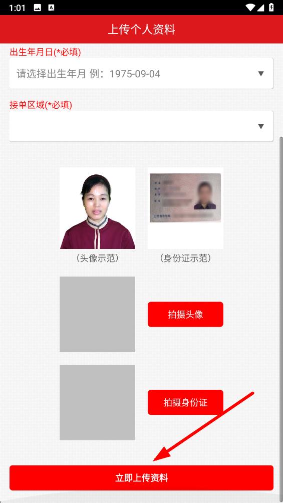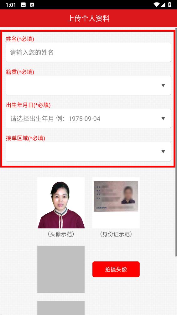 3、在上傳個人資料界面,依次填寫姓名、籍貫、出生年月日、接單區(qū)域等必填信息。