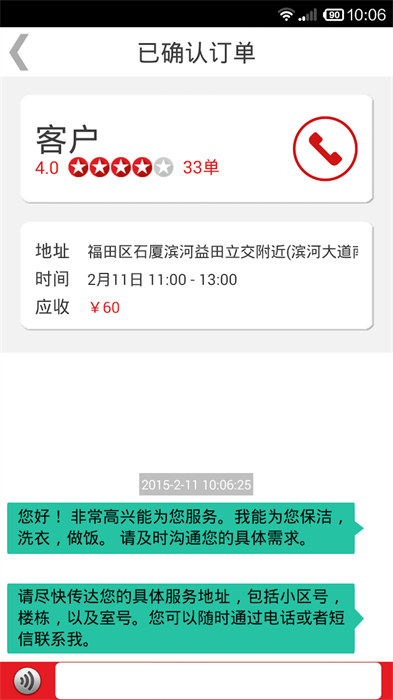 阿姨搶單成功后會立即打電話給雇主確認信息,服務完畢還可以對服務評分,幫助提升阿姨的服務質(zhì)量
