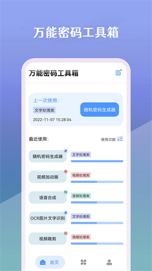 萬能密碼工具箱是一款工具箱軟件,擁有非常實用的功能,包含了視頻剪輯、音頻處理、文字處理、圖片處理等服務,每個有需要的小伙伴都能在這里找到自己想要的,讓學習、生活、工作更便捷,滿足大家的使用需求。