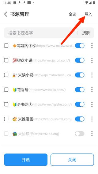 2、在書源管理頁面中,選擇右上角的導入;