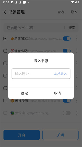 3、粘貼進入自己的書源網(wǎng)址,然后點擊確定,或者通過本地導入。