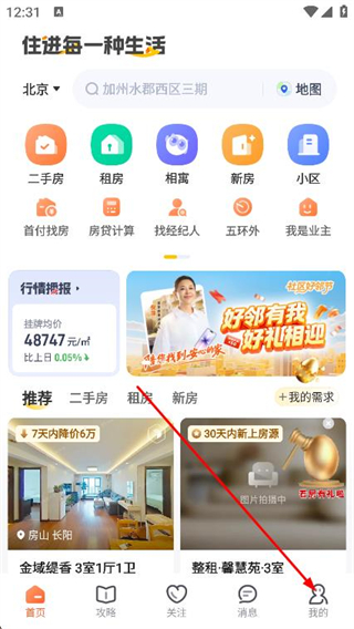 1、打開我愛我家,點擊底部導(dǎo)航欄最右側(cè)的我的。