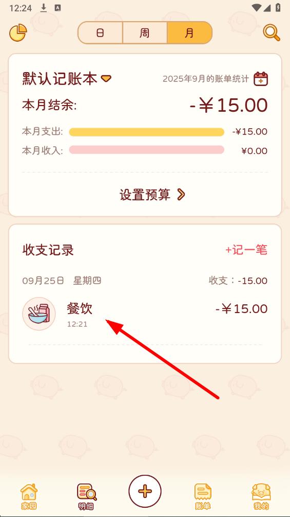 2、在明細頁面中,查看收支記錄,找到想要刪除記錄所屬的賬本,并點擊該條收支記錄。