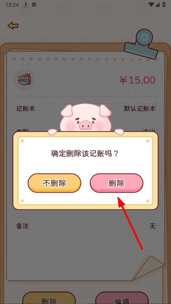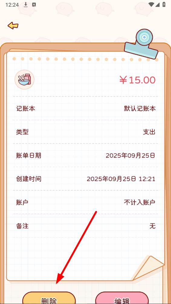 3、進入該條收支記錄詳情頁,點擊下方的刪除按鈕,觸發(fā)刪除確認操作。