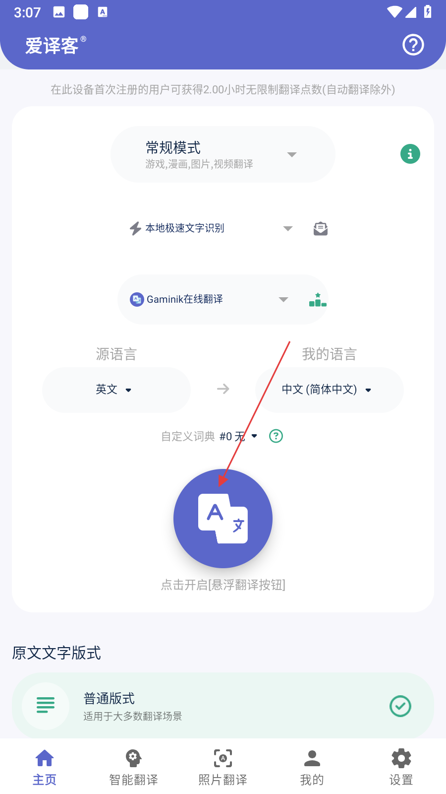 1、打開愛譯客應(yīng)用,進入主界面后,點擊頁面中間紫色懸浮翻譯按鈕。