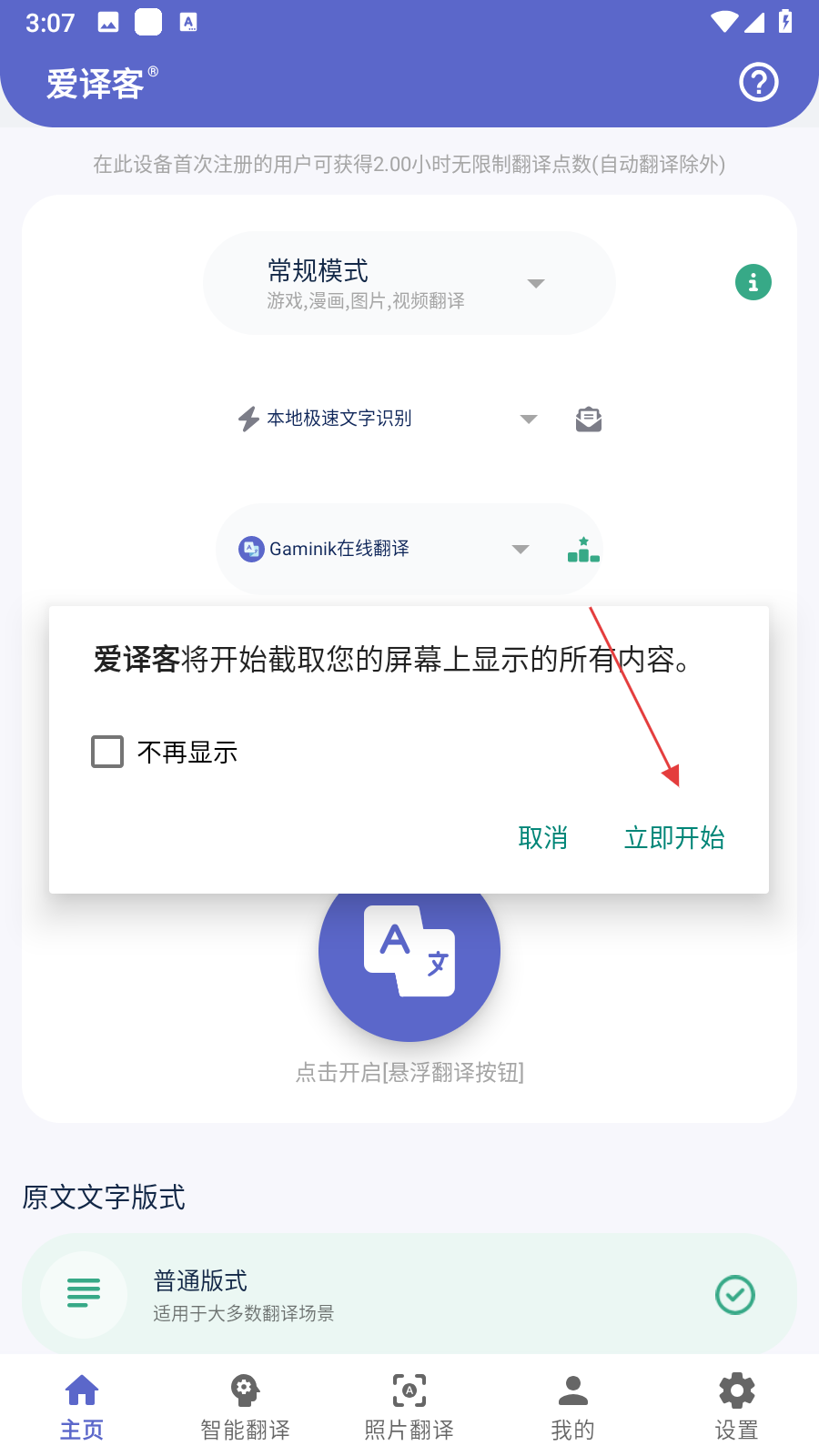 3、同意后,會彈出提示框,點擊立即開始,開啟屏幕截取功能。