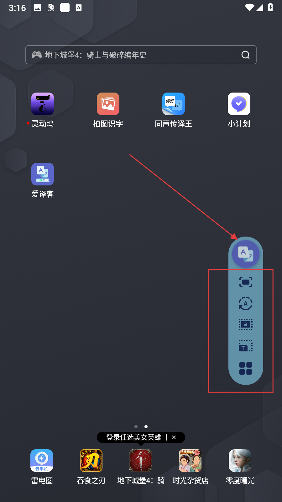 4、開啟后屏幕出現(xiàn)愛譯客懸浮球,點擊懸浮球展開功能菜單,可根據(jù)需求選擇操作。