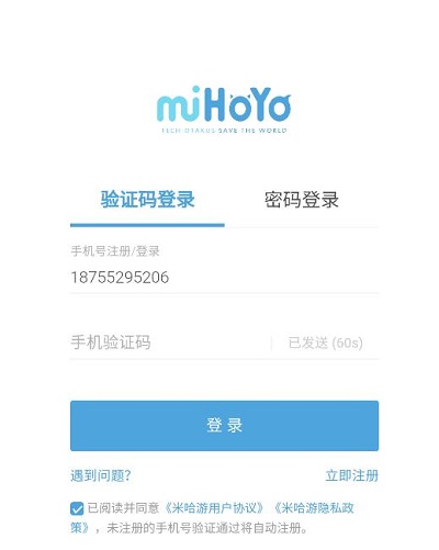 1、打開軟件之后,輸入自己的米哈游通行證,或者是手機(jī)號(hào)通過驗(yàn)證碼登錄;