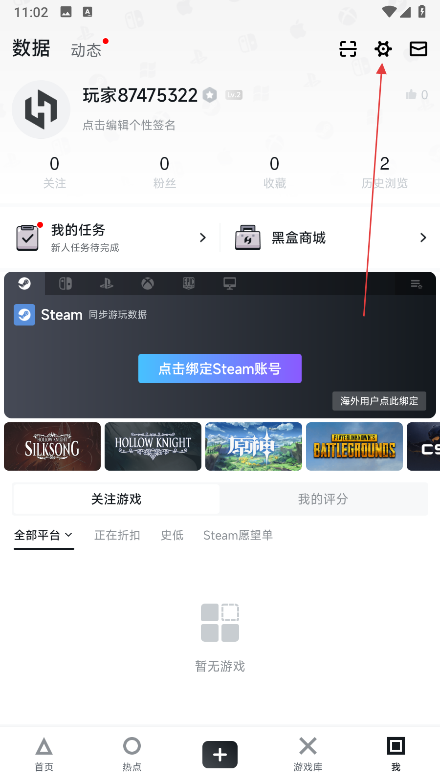 1、打開小黑盒APP,進(jìn)入我的頁面,點(diǎn)擊右上角齒輪狀的設(shè)置圖標(biāo),進(jìn)入設(shè)置界面。