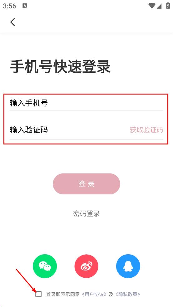 4、在手機(jī)號快速登錄界面,勾選登錄即表示同意用戶協(xié)議,再進(jìn)行后續(xù)登錄操作。