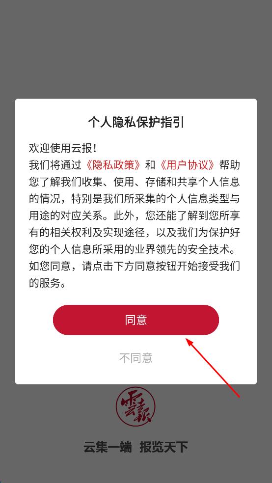 1、打開云報(bào)APP,在彈出的個(gè)人隱私保護(hù)指引頁面,點(diǎn)擊同意按鈕,開始接受服務(wù)。