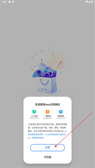 1、打開vivo應(yīng)用商店APP,進(jìn)入時會彈出隱私政策,點(diǎn)擊同意的按鈕。