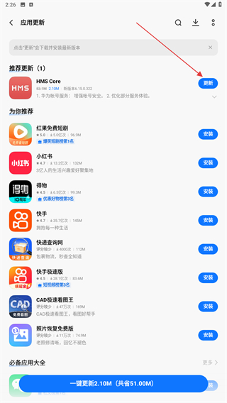 4、進(jìn)入應(yīng)用更新的頁面內(nèi),會顯示可更新的軟件,點(diǎn)擊右側(cè)更新的按鈕即可。