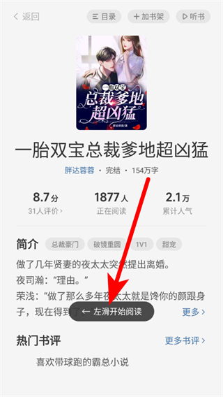 2、點(diǎn)擊進(jìn)入小說(shuō)詳情頁(yè),左滑開始閱讀小說(shuō)內(nèi)容。