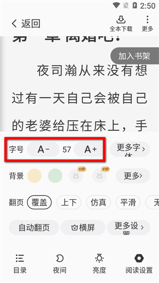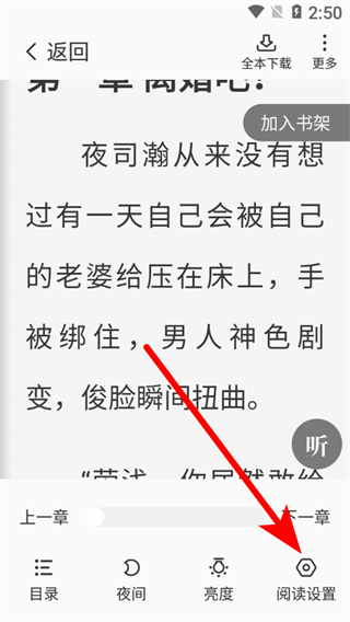 3、在小說(shuō)閱讀界面,點(diǎn)擊閱讀設(shè)置選項(xiàng),彈出設(shè)置菜單。