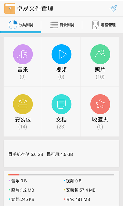 卓易文件管理器是一款功能強(qiáng)大的手機(jī)文件管理工具,體貼的分類讓您可以快速找到圖片、音頻、文件,卓易文件管理檔、視頻、壓縮包等文件,界面分為分類瀏覽、目錄瀏覽和遠(yuǎn)程管理,各種瀏覽模式不同,可以幫助您更好的管理、閱覽文件。不再糾結(jié)于N級的文件目錄,是一款好用、易用的資源管理共享類應(yīng)用軟件。