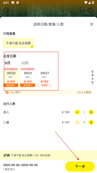 3、選好日期、套餐和人數(shù)后點擊下一步。
