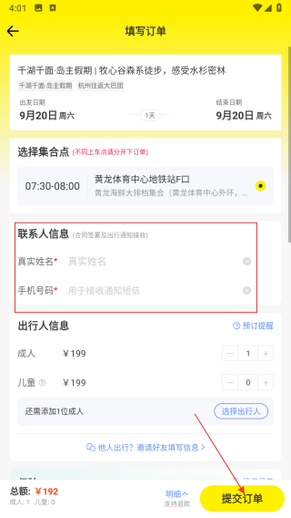4、填寫好訂單信息后確認訂單總額,點擊提交訂單完成付款,即可成功報名該旅游項目。